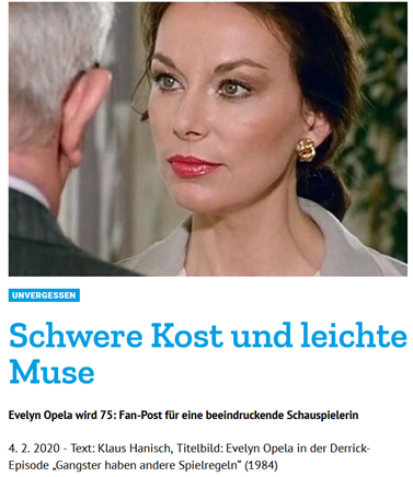 Evelyn Opela wurde in Deutschland vor allem durch Serien enorm populär. Zunächst im ZDF-„Kommissar“, in den 1970ern ein wahrer Straßenfeger, als es nur zwei Fernsehsender gab. Dann in „Tatort“-Folgen oder im „Traumschiff.“ Ihre vielen Gastspiele in den populären Freitagabend-Krimis „Derrick“ oder „Der Alte“ machten sie praktisch zu einem Stammgast in deutschen Wohnzimmern.